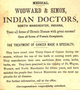 | York where Indians were plenty and he acquired an early knowledge of their language, habits and medicines. From 1843 to '46 he was sent to school in New York, and in 1846, went to St. Louis where he joined a party of explorers, and in company with them crossed the continent, finally reaching Puget Sound on the Pacific coast. Here he took up his abode with the Blackfoot Indians and trapped for the Hudson Bay Fur Company, where he remained as one of the chief's family until 1852 when he returned home in company with some trappers by way of the Red River of the North, wintering in its valley. He reached St. Paul in November, 1853 and arrived in New York in December, after an absence of seven years. From 1854 to '55 he attended Medical College of Louisville, Kentucky, and in 1856 moved to Fond du Lac, Wisconsin, and commenced the practice of Indian medicine. He carried on a successful practice there for two years, when he buried his young wife, and in a distracted state of mind started for South America, visiting the principal cities of the coast, and spending a season in Cuba. He subsequently returned to New York in the spring of 1860 and started west to visit friends at Fort Wayne, Indiana, who prevailed upon him to remain and practice there. In 1861 he married again, and his practice becoming extensive, he took a student, who is now his partner. Dr A. Simon was born in Allen County, Indiana in 1839 and commenced the study of medicine under Dr. Woodward in 1861. In 1865 he and Dr. Woodward commenced practice together in Warsaw, Indiana and in 1866, Dr. Woodward, finding his health failing left him in charge of his practice, and with his wife and child crossed the plains to the Rocky Mountains, where he renewed many old acquaintances. In 1867, he was engaged in a trading expedition which left Denver City, Colorado for the Red River country. In Wyoming several hostile bands of Indians were encountered and in one affray Dr. Woodward was severely wounded but subsequently recovered so as to proceed with his party. Communication being cut off in their rear for two years their friends supposed the party to have been totally destroyed until their return to Denver City in 1869. In 1870 the Doctor was at the head of another party who travelled through Arizona, New Mexico, Mexico and Lower California, spend | |||