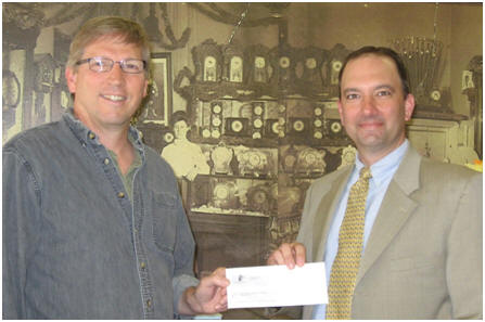 Jim Chinworth (left) of the North Manchester Historic Home Preservation Group receives a $40,000 interest-free loan from Todd Zieger (right), Director of the Northern Regional Office of Indiana Landmarks. The loan will be used to cover renovations to a home the group is restoring at 512 W. Third Street. Repayment of the loan will occur once the restored house is sold.