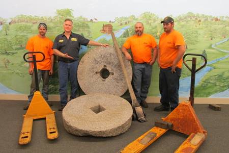 Mark Ryner, hoist a 1,000+ lb. grist mill stone to be displayed at the North